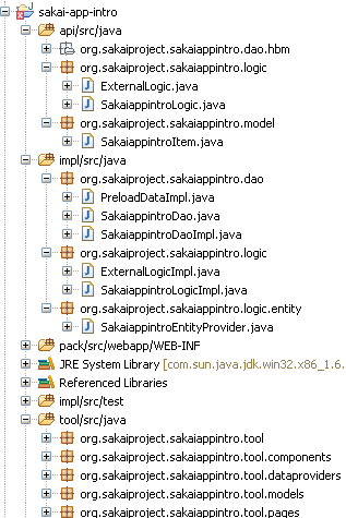 tool/src/java处理servlet请求,调用业务逻辑模块(ExternalLogic和SakaiappintroLogic),业务逻辑模块再调用dao,dao再调用hibernate。注意注意,tool不会调用dao,更不会调用hibernate;业务模块也不会直接调用hibernate。