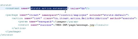 1.如果你不想适应struts2特有的url的".action"的后缀名,其实你是可以去修改他的,下面的图片是把后缀改成了struts1中的".do",修改struts.xml: