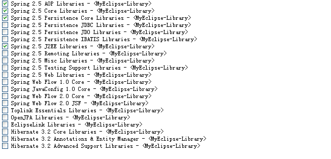 只需要选中 Spring2.5 J2EE 此选项后, 其他的项会自动选中,包括后面要学习的AOP的包也导入了.