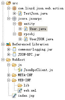 package jcore.jsonrpc.rpcobj;//必须是jcore.jsonrpc.rpcobj包下才可以免注册import java.util.ArrayList;import java.util.HashMap;import java.util.List;import java.util.Map;import jcore.jsonrpc.common.JsonRpcObject;import jcore.jsonrpc.entity.User;public class UserJSON extends JsonRpcObject implements java.io.Serializable{private static final long serialVersionUID = 1L;/** * 直接返回普通类型 * */public String helloJSONPRC(String userName){//可从getAllInputParms获取页面值//String userName = (String)this.getAllInputParms().get("userName");return "Hello World "+userName +" !";}/*** * 返回JavaBean类型 * */public User getUser(){return new User(1,"张三","123456",25);}public String saveUser(User user){System.out.println("id: "+user.getUserId() + ",name:" + user.getUserName() + ",password: " + user.getUserPassword() + ",age: " + user.getAge());return "保存用户成功!";}/** * 返回List集合 * */public List<User> getUserAll(){ List<User> users = new ArrayList<User>(); users.add(new User(1,"张三","123456",25)); users.add(new User(2,"李逵","123123",20)); return users; }/** * 返回Map集合 * */public Map<String,User> getUserMapAll(){ Map<String,User> maps = new HashMap<String,User>(); maps.put("1",new User(1,"张三","123456",25)); maps.put("2",new User(2,"李逵","123123",20)); return maps; }}package jcore.jsonrpc.entity;public class User implements java.io.Serializable{private static final long serialVersionUID = 1L;private int userId;private String userName ;private String userPassword;private int age ;public int getUserId() {return userId;}public void setUserId(int userId) {this.userId = userId;}public String getUserName() {return userName;}public void setUserName(String userName) {this.userName = userName;}public String getUserPassword() {return userPassword;}public void setUserPassword(String userPassword) {this.userPassword = userPassword;}public int getAge() {return age;}public void setAge(int age) {this.age = age;}public User(int userId, String userName, String userPassword, int age) {super();this.userId = userId;this.userName = userName;this.userPassword = userPassword;this.age = age;}/** * 必须注意:JSON-RPC必须要求你的JavaBean对象要用默认的无参构造函数 * */public User(){}}<servlet><servlet-name>JSONRPCServlet</servlet-name><servlet-class>jcore.jsonrpc.servlet.JSONRPCServlet</servlet-class><load-on-startup>2</load-on-startup></servlet><servlet-mapping><servlet-name>JSONRPCServlet</servlet-name><url-pattern>/JRPC</url-pattern></servlet-mapping>