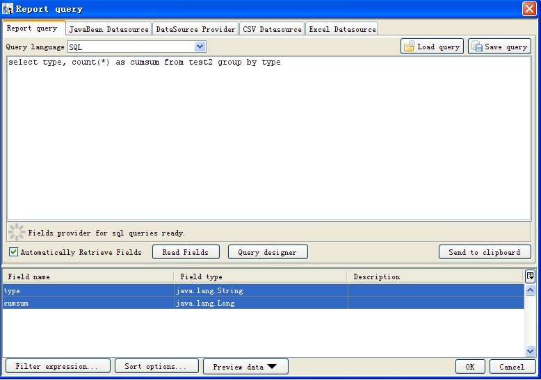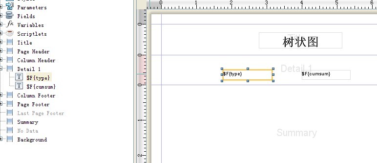 根据图上SQL语句得到了type和cumsum两个字段,大家在ireport能不用数据库中的关键字做字段就最好不用,免得有麻烦。我将type和cumsum拉到了detail中,目的就是为了循环输出,说到输出让我想起了一句话:程序无非就是输入和输出。