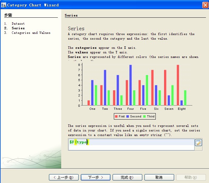 然后现在就要进行数据填充了,我这里没有创建子数据集,所以选择默认的主报表中的数据集就行了,下一步:Series 大家看下面图上的注释就明白什么意思了