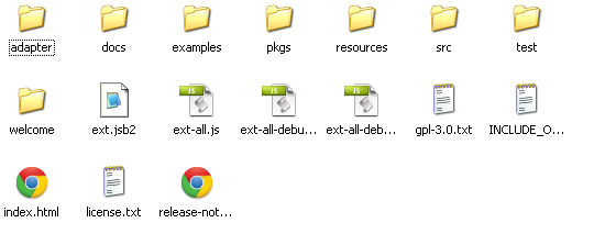 adapter: 提供Ext的底层库 docs : API 帮助文档 exmaples: 提供使用Extjs的小事例 resoures: Ext UI资源文件目录 比如 图片 ,CSS等等 source : 无压缩Ext 全部的源码 ext-all.js :压缩后的Ext 全部源码 ext-all-debug.js:无压缩的Ext 全部的源码(用于调试)。