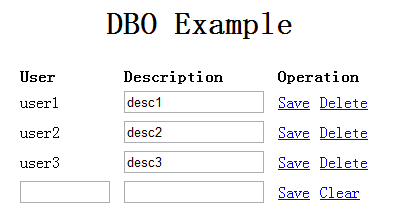 $(function(){bind();// 每次修改数据时重新排序并渲染页面、绑定事件function show() {sort();views.index($, users);bind();}function sort() {// users 重新排序,略}// 绑定事件function bind() {var rows = $("#content tr[index] a"),last= $("#content tr:last a");rows.filter(":even").click(update);rows.filter(":odd").click(remove);last.eq(0).click(add);last.eq(1).click(clear);}// 增加 user ,需要重新排序和渲染function add() {var $input = $(this).parent().parent().find("input"),$name = $input.eq(0),$desc = $input.eq(1),name = $name.val(),desc = $desc.val();// 数据验证,略var user = { name: name, desc: desc };users.push(user);save(user);}function clear() {// 清空数据,略}// 修改 user ,需要重新排序和渲染function update() {var $tr = $(this).parent().parent(),$desc = $tr.find("input"),index = $tr.attr("index"),desc = $desc.val();// 数据验证,略var user = users[parseInt(index)];user.desc = desc;save(user);}// 删除 user ,需要重新排序和渲染,并发送请求function remove() {var $tr = $(this).parent().parent(),index = $tr.attr("index");$tr.remove();var name = users.splice(index, 1)[0].name;show();pure.post({ action: "users.remove", params: name });}// 在增加或保存修改 user 时调用,重新排序和渲染,并发送请求function save(user) {show();pure.post({ action: "users.save", params: user });}});