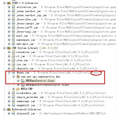 import java.util.Iterator;import java.util.Properties;import java.util.Set;import sun.net.spi.nameservice.dns.DNSNameService;public class test { public static void main(String[] args) throws Exception{Properties p=System.getProperties();Set<Object> s=p.keySet();Iterator<Object> i=s.iterator();while((i).hasNext()){String key=(String)i.next();if(key.contains("java.class.path")||key.contains("java.ext.dirs")||key.contains("sun.boot.class.path"))System.out.println(key+":"+p.get(key));}System.out.println(new DNSNameService().getClass().getClassLoader());}}java.class.path:D:\dhw\workspace\test\WebRoot\WEB-INF\classes;D:\dhw\workspace\framework\WebRoot\WEB-INF\lib\classes12.jar java.ext.dirs:D:\ProgramFiles\Java\jdk1.6.0_29\jre\lib\ext;C:\WINDOWS\Sun\Java\lib\ext sun.boot.class.path:D:\ProgramFiles\MyEclipse10\Common\plugins\com.genuitec.eclipse.j2eedt.core_10.0.0.me201110301321\data\libraryset\1.4\activation.jar;D:\ProgramFiles\MyEclipse10\Common\plugins\com.genuitec.eclipse.j2eedt.core_10.0.0.me201110301321\data\libraryset\1.4\javax.servlet.jar;D:\ProgramFiles\MyEclipse10\Common\plugins\com.genuitec.eclipse.j2eedt.core_10.0.0.me201110301321\data\libraryset\1.4\javax.servlet.jsp.jar;D:\ProgramFiles\MyEclipse10\Common\plugins\com.genuitec.eclipse.j2eedt.core_10.0.0.me201110301321\data\libraryset\1.4\jboss-j2ee.jar;D:\ProgramFiles\MyEclipse10\Common\plugins\com.genuitec.eclipse.j2eedt.core_10.0.0.me201110301321\data\libraryset\1.4\jboss-jaxrpc.jar;D:\ProgramFiles\MyEclipse10\Common\plugins\com.genuitec.eclipse.j2eedt.core_10.0.0.me201110301321\data\libraryset\1.4\jboss-jsr77.jar;D:\ProgramFiles\MyEclipse10\Common\plugins\com.genuitec.eclipse.j2eedt.core_10.0.0.me201110301321\data\libraryset\1.4\jboss-saaj.jar;D:\ProgramFiles\MyEclipse10\Common\plugins\com.genuitec.eclipse.j2eedt.core_10.0.0.me201110301321\data\libraryset\1.4\mail.jar;D:\ProgramFiles\MyEclipse10\Common\plugins\com.genuitec.eclipse.j2eedt.core_10.0.0.me201110301321\data\libraryset\1.4\namespace.jar;D:\ProgramFiles\MyEclipse10\Common\plugins\com.genuitec.eclipse.j2eedt.core_10.0.0.me201110301321\data\libraryset\1.4\xml-apis.jar;D:\Program Files\Java\jdk1.6.0_29\jre\lib\resources.jar;D:\Program Files\Java\jdk1.6.0_29\jre\lib\rt.jar;D:\Program Files\Java\jdk1.6.0_29\jre\lib\sunrsasign.jar;D:\Program Files\Java\jdk1.6.0_29\jre\lib\jsse.jar;D:\Program Files\Java\jdk1.6.0_29\jre\lib\jce.jar;D:\Program Files\Java\jdk1.6.0_29\jre\lib\charsets.jar;D:\Program Files\Java\jdk1.6.0_29\jre\lib\modules\jdk.boot.jar;D:\Program Files\Java\jdk1.6.0_29\jre\classessun.misc.Launcher$ExtClassLoader@6b97fd