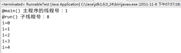 public class ThreadTest extends Thread { public void run() { System.out.println("@run() 子线程号:" + Thread.currentThread().getId()); for(int i=0; i<5; i++) System.out.println("i=" + i); } public static void main(String[] args) { ThreadTest tt = new ThreadTest(); tt.start(); System.out.println("@main() 主程序的线程号:" + Thread.currentThread().getId()); }}public class RunnableTest implements Runnable { public void run() { System.out.println("@run() 子线程号:" + Thread.currentThread().getId()); for(int i=0; i<5; i++) System.out.println("i=" + i); } public static void main(String[] args) { Thread t = new Thread(new RunnableTest()); t.start(); System.out.println("@main() 主程序的线程号:" + Thread.currentThread().getId()); }}