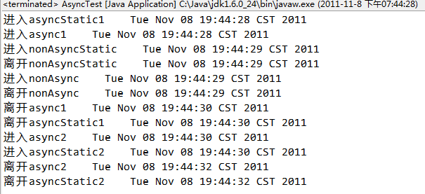 import java.util.Date;class AsyncObj { public synchronized static void asyncStatic1() throws InterruptedException { System.out.println("进入asyncStatic1 " + new Date()); Thread.sleep(2000); System.out.println("离开asyncStatic1 " + new Date()); } public synchronized static void asyncStatic2() throws InterruptedException { System.out.println("进入asyncStatic2 " + new Date()); Thread.sleep(2000); System.out.println("离开asyncStatic2 " + new Date()); } public synchronized void async1() throws InterruptedException { System.out.println("进入async1 " + new Date()); Thread.sleep(2000); System.out.println("离开async1 " + new Date()); } public synchronized void async2() throws InterruptedException { System.out.println("进入async2 " + new Date()); Thread.sleep(2000); System.out.println("离开async2 " + new Date()); } public void nonAsync() throws InterruptedException { Thread.sleep(1000); System.out.println("进入nonAsync " + new Date()); System.out.println("离开nonAsync " + new Date()); } public static void nonAsyncStatic() throws InterruptedException { Thread.sleep(1000); System.out.println("进入nonAsyncStatic " + new Date()); System.out.println("离开nonAsyncStatic " + new Date()); }}public class AsyncTest extends Thread { public AsyncObj sharedObj; public int asyncTestThreadId; public AsyncTest(int asyncTestThreadId, AsyncObj sharedObj) { this.sharedObj = sharedObj; this.asyncTestThreadId = asyncTestThreadId; } public void run() { try { switch(asyncTestThreadId) { case 0: sharedObj.async1(); //锁定实例对象 break; case 1: sharedObj.async2(); break; case 2: sharedObj.nonAsync(); break; case 3: AsyncObj.asyncStatic1(); //锁定类对象 break; case 4: AsyncObj.asyncStatic2(); break; case 5: AsyncObj.nonAsyncStatic(); break; } } catch (InterruptedException e) { e.printStackTrace(); } } public static void main(String[] args) { AsyncObj sharedObj = new AsyncObj(); // 被访问的实例对象 AsyncTest[] threads = new AsyncTest[6]; // 多个访问线程 for (int i = 0; i < 6; i++) { threads[i] = new AsyncTest(i, sharedObj); threads[i].start(); } }}