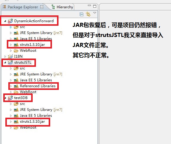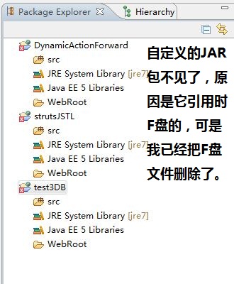 这个图片里你就会发现没有了STRUTSJAR包,因为它已经不存在了。后来我又把JAR包从回收站复原回去,可是仍然报错!!!如图: