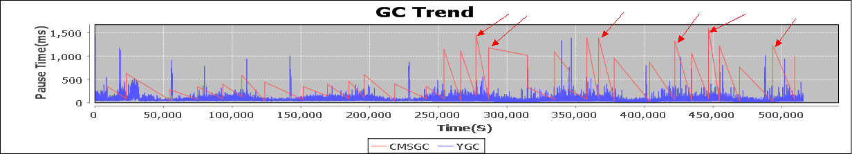 第三轮调优运营一段时间后,发现CMSGC超过一秒的情况非常多(图中箭头指向):