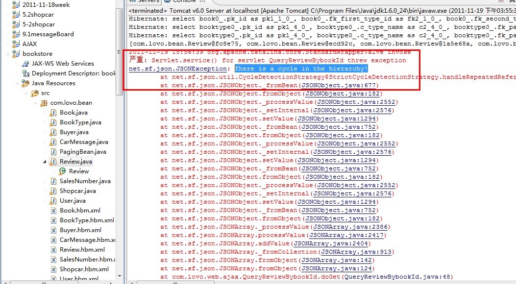 今天在完善自己做的网上书店的项目的时候,在查看书籍评论的时候准备使用ajax来操作(之前是直接页面全部刷新,感觉不爽,刚刚学了ajax,所以觉得ajax来弄),后台是用hibernate来操作数据库的。但是当写完代码测试的时候突然报错了。 如图