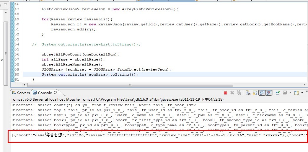 然后把从数据库里面读出来的数据list遍历后把值全部取出来并一一赋值给新创建的这个javabean对象,在重新 new一个list,用来装改变后的对象。这样最后再用JSONArray.formObject(list),放入新建的list集合,这样转换就可以成功了。如图成功了没报错。