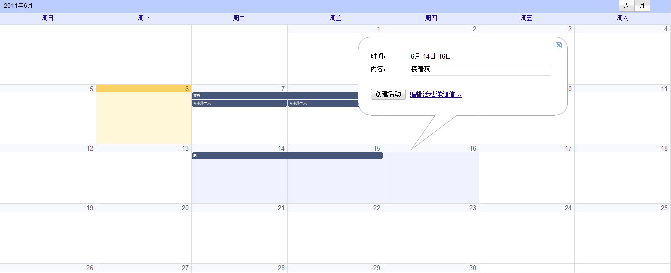 如题,用Jquery仿的google calender 部分功能,主要目的还是想提高一下自己对Jquery的熟练程度。现在模仿了月视图和周视图。如图: