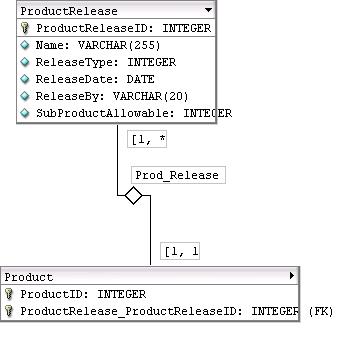在图 1 的范例中,有两个表:Product 和 ProductRelease。每条 product 记录都有一个 ProductReleaseID 参考相应的产品出厂记录,包括 product release name、type、release date 等等。