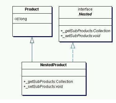 图 2 展示了由数据模型解释的对象模型。Nested 接口定义了 getSubProducts 和 setSubProducts 方法。NestedProduct 类继承 Product 基类并实现 Nested 接口。无论产品数据记录是 Product 或 NestedProduct,都取决于产品出厂记录中 SubProductAllowable 的值。
