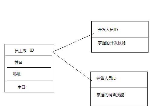 比如开发人员表中只有一个字段,销售人员表中有多个字段,那么为开发人员单独加一张表有点浪费,可以将开发人员表与普通员工表二合一,只需要单独为销售人员增加一张表即可.