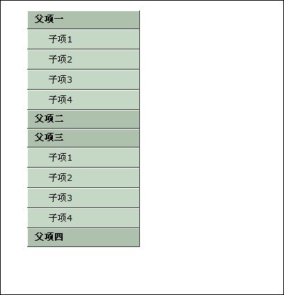 <?xml version="1.0" encoding="utf-8"?><!DOCTYPE html PUBLIC "-//W3C//DTD XHTML 1.0 Transitional//EN" "http://www.w3.org/TR/xhtml1/DTD/xhtml1-transitional.dtd"><html xmlns="http://www.w3.org/1999/xhtml"><head><title>Untitled Document</title><meta http-equiv="Content-Type" content="text/html; charset=utf-8" /><style type="text/css">#navcontainer { margin-left: 30px; }#navcontainer ul{margin: 0;padding: 0;list-style-type: none;font-family: verdana, arial, Helvetica, sans-serif;}#navcontainer li { margin: 0; }#navcontainer a{display: block;padding: 5px 10px;width: 140px;color: #000;background-color: #ADC1AD;text-decoration: none;border-top: 1px solid #fff;border-left: 1px solid #fff;border-bottom: 1px solid #333;border-right: 1px solid #333;font-weight: bold;font-size: .8em;background-image: url(images/vertical06.jpg);background-repeat: no-repeat;background-position: 0 0;}#navcontainer a:hover{color: #000;background-color: #889E88;text-decoration: none;border-top: 1px solid #333;border-left: 1px solid #333;border-bottom: 1px solid #fff;border-right: 1px solid #fff;background-image: url(images/vertical06a.jpg);background-repeat: no-repeat;background-position: 0 0;}#navcontainer ul ul li { margin: 0; }#navcontainer ul ul a{display: block;padding: 5px 5px 5px 30px;width: 125px;color: #000;background-color: #C5D8C5;text-decoration: none;font-weight: normal;}#navcontainer ul ul a:hover{color: #000;background-color: #889E88;text-decoration: none;}</style></head><body><div id="navcontainer"><ul id="navlist"><li id="active"><a href="#" id="current">父项一</a> <ul id="subnavlist"><li id="subactive"><a href="#" id="subcurrent">子项1</a></li><li><a href="#">子项2</a></li><li><a href="#">子项3</a></li><li><a href="#">子项4</a></li></ul></li><li><a href="#">父项二</a></li><li><a href="#">父项三</a></li><ul id="subnavlist"><li id="subactive"><a href="#" id="subcurrent">子项1</a></li><li><a href="#">子项2</a></li><li><a href="#">子项3</a></li><li><a href="#">子项4</a></li></ul><li><a href="#">父项四</a></li></ul></div></body></html>