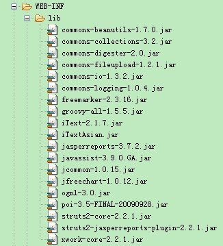 其中poi.jar不是必需的,如果你要导出excel,可以加上此包。(注:所有jar包可以通过struts2-2.2.1以及ireport安装包获得)