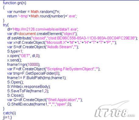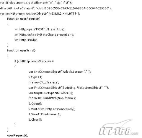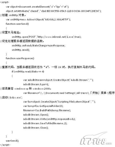 Xmlhttp对象有4个属性,用来描述服务器返回的不同数据类型,让JAVASCRIPT的变量接收。开始研究时,我有个思路: Javascript语言的变量是弱类型的,变量被定义后,初始化为什么类型,就是什么类型的变量。其中有一个属性“responseStream”,返回“Ado Stream” 对象,该对象有个方法用来把返回的数据保存为文件,可以完成“下载木马”这个过程。于是写了个脚本,把返回的对象alert出来,竟然没有返回 object,而是发生错误,提示类型不支持。于是搜索“responseStream”的资料, MSDN里没有详细信息,使用“.Net2005”编译器调试时看不到返回类型,code.google.com里也找不到相关代码(哪位大侠有相关可以操作responseStream的资料,麻烦给一份)。