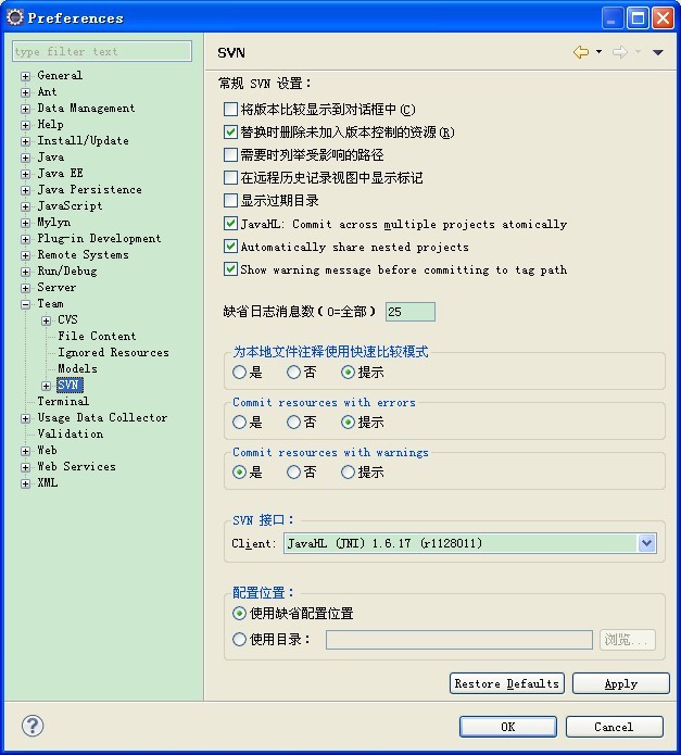 OK,到此为止,重新启动 Eclipse 吧,看看是否出现 SVN 了。