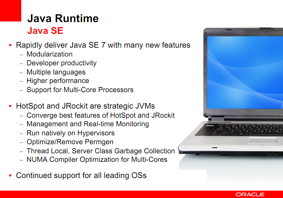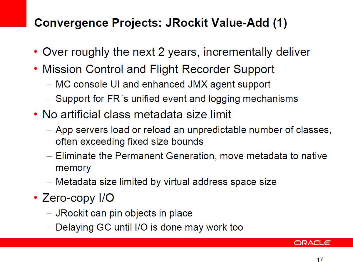 JavaOne 2010上,题为“Oracle's JVM Strategy”的演讲同样提到要将HotSpot与JRockit合并到一起,并透露了更多细节:以HotSpot为主,将JRockit一些优秀的部分移植到HotSpot中。其中,同样提到了要移除“permanent generation”。
