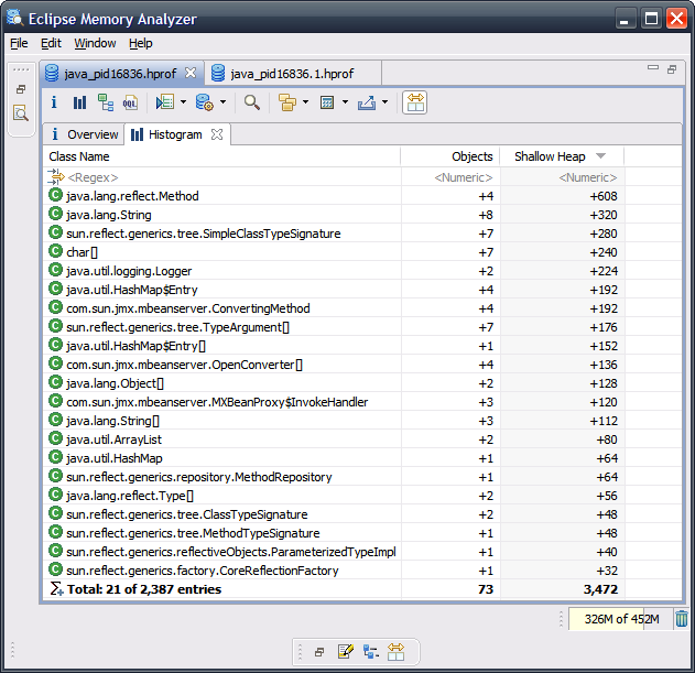 点击上方工具条最右边的“<->”按钮,并选上第二个heap dump文件之后,可以看到: