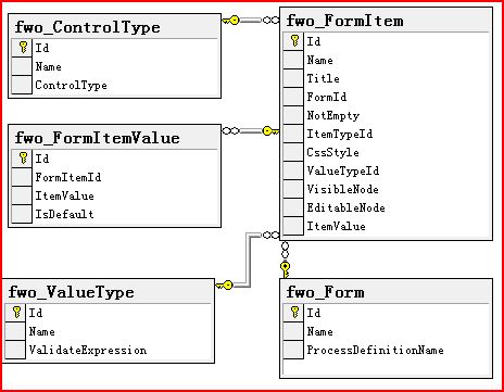 每个流程定义了一个Form,FormItem里存放这个Form里各有什么控件,以及控件的类型及值类型等。据我了解,Java(或者Jsp)里,没有像.NET里那样的动态加载控件机制,所以,我写了一个Bean,根据传进来的流程名称,来加载相应的表单及里面的控件。