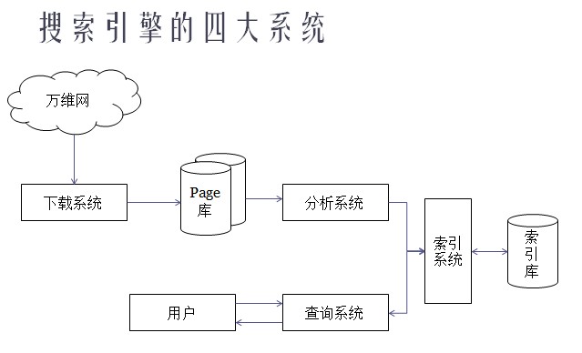 在搜索引擎这套系统中,如果按照运行流程来分,可以分为四个子系统,分别是:下载系统、分析系统、索引系统和查询系统。