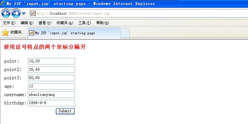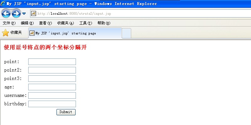 <body><h3><font color="red">使用逗号将点的两个坐标分隔开</font></h3><s:form action="pointConverter"><s:textfield name="point" label="point"></s:textfield><s:textfield name="point2" label="point2"></s:textfield><s:textfield name="point3" label="point3"></s:textfield><s:textfield name="age" label="age"></s:textfield><s:textfield name="username" label="username"></s:textfield><s:textfield name="date" label="birthday"></s:textfield><s:submit label="submit"></s:submit></s:form> </body>