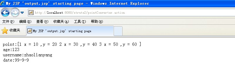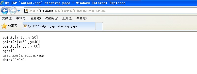 package com.test.action;import java.util.Date;import com.opensymphony.xwork2.ActionSupport;import com.test.bean.Point;public class PointAction extends ActionSupport{private Point point;private Point point2;private Point point3;private int age;private String username;private Date date;public Point getPoint() {return point;}public void setPoint(Point point) {this.point = point;}public Point getPoint2() {return point2;}public void setPoint2(Point point2) {this.point2 = point2;}public Point getPoint3() {return point3;}public void setPoint3(Point point3) {this.point3 = point3;}public int getAge() {return age;}public void setAge(int age) {this.age = age;}public String getUsername() {return username;}public void setUsername(String username) {this.username = username;}public Date getDate() {return date;}public void setDate(Date date) {this.date = date;}@Overridepublic String execute() throws Exception {return SUCCESS;}}point=com.test.converter.PointConverterpoint2=com.test.converter.PointConverterpoint3=com.test.converter.PointConverter