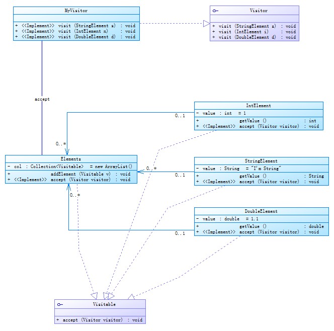 for(A a : collection){ if(a instance of B){//..... }else if(a instance of C){//..... }else ....}public interface Visitor {public void visit(StringElement s);public void visit(IntElement n);public void visit(DoubleElement d);}public interface Visitable {public void accept(Visitor visitor);}public class IntElement implements Visitable{private int value = 1;public int getValue(){return this.value;}public void accept(Visitor visitor) {visitor.visit(this);}}public class StringElement implements Visitable{private String value = "I'm String";public String getValue(){return this.value;}public void accept(Visitor visitor) {visitor.visit(this);}}public class Elements implements Visitable{private Collection<Visitable> col = new ArrayList();public void addElement(Visitable v){col.add(v);}public void accept(Visitor visitor) {for(Visitable v : col){v.accept(visitor);}}}public static void main(String args[]){Elements es = new Elements();es.addElement(new StringElement());es.addElement(new IntElement());es.addElement(new DoubleElement());MyVisitor mv = new MyVisitor();es.accept(mv);}element.StringElement:I'm Stringelement.IntElement:1element.DoubleElement:1.1