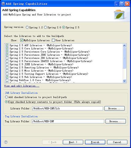 3.加载spring,选中工程名,右击并选择【MyEclipse】选项下的【Add Spring Capabilities...】(或者在工具栏中选择【MyEclipse】下的【Add Spring Capabilities...】),在弹出的对话框中进行如下图所示操作: