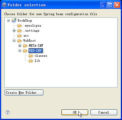 点击【Next】,点击Folder文本框后的【Browse】,在弹出对话框中选择spring配置文件存储位置为WEB-INF文件夹,如下图所示: