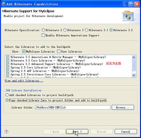 4.加载Hibernate,选择【MyEclipse】下的【Add Hibernate Capabilities...】,在弹出对话框中进行如下图所示操作: