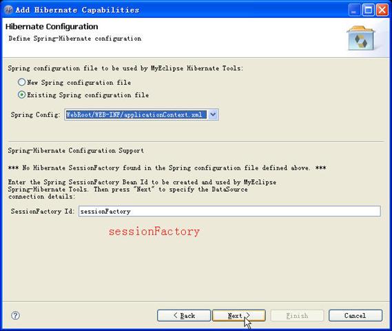 点击【Next】后,选择Existing Spring configuration file单选框,在SessionFactory Id文本框中填入"sessionFactory",如下图所示 :