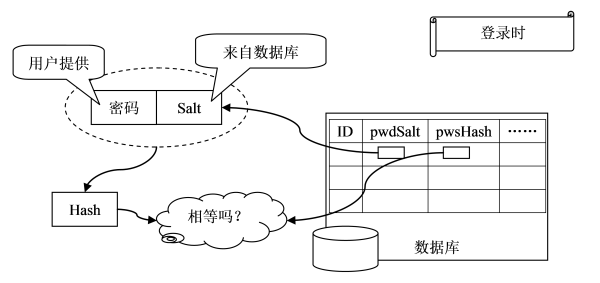 5)比较Hash和Hash'是否相等,相等则表示密码正确,否则表示密码错误。