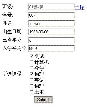 如学生选客,学生和课程多对多,主控方在学生,这个时候我们的课程一方就可主动声明” inverse="true"” (具体hibernate怎么配置请参看《我的O/R MAPPING (HIBERNATE)方法小结》)那么页面有可能是这样: