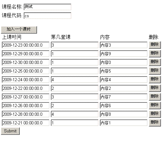 课程和课程安排是聚合关系,课程安排组成了课程,课程安排离开了课程不存在意义(这通常说明课程安排不会有自己单独的增,删,改,查页面,而对它得增,删,改,查通常通过课程来完成)这个时候要没课程安排是一个hibernate组建,也可以是一个一对多的关联关系并且同时配置cascade="all-delete-orphan"/"all"和fetch="join" lazy="false"。也就是说查看课程通常同时查看课程安排,课程安排的操作通过课程的操作级联来完成。这个时候页面通常是这样: