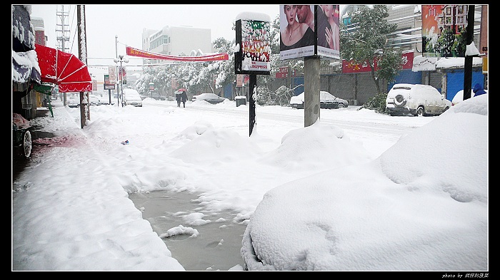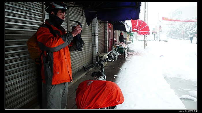 这时候的雪越下越大,没多久身上就会白仆仆的积上一层雪。往前骑了一段, 找了一个小镇, 准备再买一个手机上路, 想象这一路没个手机联系简直是不可想象的。在移动的营业厅, 因为要取回原来的号码需要提供最近打出的10个电话号码才能拿到自己的号码, 无奈我想来想去只能提供9个号码, 因为最后的那一个让我取回原来号码的徒劳。只好重新买了号码, 一共花了400大洋选了最便宜的一款充话费送手机服务。差不多下午2,3点我们才又开始上路。