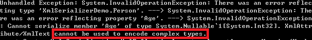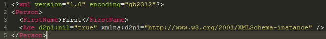 [Serializable] [XmlRoot(ElementName = "Person")] public class Person { [XmlAttribute] public string FirstName { get; set; } [XmlAttribute] public string LastName { get; set; } [XmlAttribute] public int? Age { get; set; } }