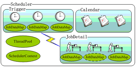 Job:是一个接口只有一个方法void execute(JobExecutionContext context),开发者实现该接口定义运行任务,JobExecutionContext类提供了调度上下文的各种信息。Job运行时的信息保存在JobDataMap实例中