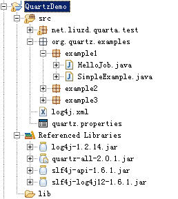 import java.util.Date;import org.slf4j.Logger;import org.slf4j.LoggerFactory;import org.quartz.Job;import org.quartz.JobExecutionContext;import org.quartz.JobExecutionException;public class HelloJob implements Job { private static Logger _log = LoggerFactory.getLogger(HelloJob.class); public HelloJob() { } public void execute(JobExecutionContext context) throws JobExecutionException { _log.error(" 咫尺天涯: " + new Date()); }}import static org.quartz.JobBuilder.newJob;import static org.quartz.TriggerBuilder.newTrigger;import static org.quartz.DateBuilder.*;import java.util.Date;import org.quartz.JobDetail;import org.quartz.Scheduler;import org.quartz.SchedulerFactory;import org.quartz.Trigger;import org.quartz.impl.StdSchedulerFactory;import org.slf4j.Logger;import org.slf4j.LoggerFactory;public class SimpleExample {private static Logger log = LoggerFactory.getLogger(SimpleExample.class);public void run() throws Exception {// 通过SchedulerFactory获取一个调度器实例SchedulerFactory sf = new StdSchedulerFactory();Scheduler sched = sf.getScheduler();Date runTime = evenMinuteDate(new Date());// 通过过JobDetail封装HelloJob,同时指定Job在Scheduler中所属组及名称,这里,组名为group1,而名称为job1。JobDetail job = newJob(HelloJob.class).withIdentity("job1", "group1").build();// 创建一个SimpleTrigger实例,指定该Trigger在Scheduler中所属组及名称。// 接着设置调度的时间规则.当前时间运行Trigger trigger = newTrigger().withIdentity("trigger1", "group1").startAt(runTime).build();// 注册并进行调度sched.scheduleJob(job, trigger);// 启动调度器sched.start();try {//当前线程等待65秒Thread.sleep(65L * 1000L);} catch (Exception e) {}//调度器停止运行sched.shutdown(true);log.error("结束运行。。。。");}public static void main(String[] args) throws Exception {SimpleExample example = new SimpleExample();example.run();}}