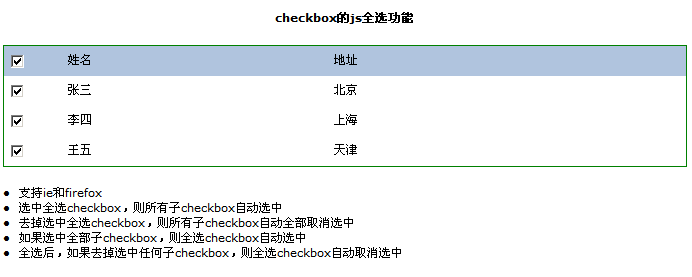 在WEB项目中关于全选的checkbox功能肯定会遇到,而且每个项目中都会有不少的地方会用到。下面把以前自己用的例子贴出来,在ie和firefox下都可以正常运行,有兴趣的朋友也可以参考下。