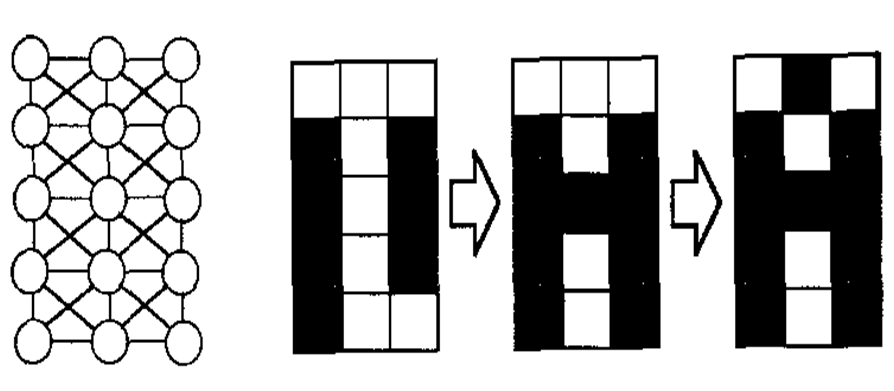 H网的E能量函数,平稳点——谷,这些谷与要记忆的内容对应。设法把所需记忆的模式设计成某个确定网络状态的一个稳定平衡点。当网络从与记忆模式较靠近的某个初始状态(即发生某些变形或含有某些噪声的记忆模式)出发后,网络按H网工作运行规则进行状态更新;最后网络的状态将稳定在能量函数的极小点,即记忆模式所对应的状态。这样,就完成了由部分信息(含躁声的记忆模式)到全部信息(记忆模式)的联想过程。