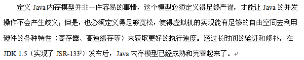关于为何store之后又要write的问题,从上面图片你可以看到,这2个操作是作用在不同区域上的,你把main memory和work memory看作2间房子,这2个操作就好比开门,要把物品A从房间以拿到(复制到)房间B,自然要分别进行“拿出来”和“放进去”2个操作。为什么不定义一个诸如transfer之内的操作一次过完成呢?那是因为这6个操作都是“原子的”,不可拆分,如果定义一个原子的“transfer”操作当然也可以完成任务,但原子操作的范围更大,也就意味这个操作的锁定时间更长。这与JMM规范的基本思想:既准确又宽松(见下面图片)相违背了。