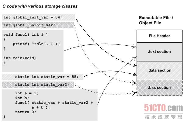 一般C语言的编译后执行语句都编译成机器代码,保存在.text段;已初始化的全局变量和局部静态变量都保存在. data段;未初始化的全局变量和局部静态变量一般放在一个叫."bss"的段里。我们知道未初始化的全局变量和局部静态变量默认值都为0,本来它们也可以被放在.data段的,但是因为它们都是0,所以为它们在.data段分配空间并且存放数据0是没有必要的。程序运行的时候它们的确是要占内存空间的,并且可执行文件必须记录所有未初始化的全局变量和局部静态变量的大小总和,记为.bss段。所以.bss段只是为未初始化的全局变量和局部静态变量预留位置而已,它并没有内容,所以它在文件中也不占据空间。