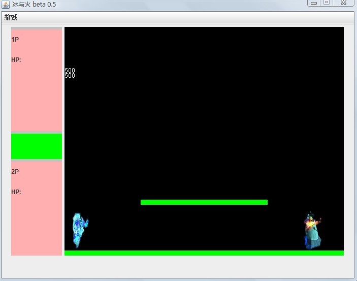 // 重写父类绘制窗体的方法public void paint(Graphics g) {if (offScreenImage == null) {// 截取窗体所在位置的图片offScreenImage = this.createImage(550, 450);}// 获得截取图片的画布Graphics gImage = offScreenImage.getGraphics();// 获取画布的底色并且使用这种颜色填充画布Color c = Color.BLACK;gImage.setColor(c);gImage.fillRect(0, 0, 550, 450); // 有清除上一步图像的功能,相当于gImage.clearRect(0,super.paint(gImage);gImage.setColor(Color.green);gImage.fillRect(0, 440, 550, 10);gImage.fillRect(150, 340, 250, 10);//显示冰英雄的血量String str = Integer.toString(IceHero.HP); gImage.setColor(Color.WHITE);gImage.drawString(str,0, 90);//显示火英雄的血量String str2 = Integer.toString(FireHero.HP); gImage.setColor(Color.WHITE);gImage.drawString(str2,0, 100);if (IceHero.d == 1) {gImage.drawImage(iceh, IceHero.x, IceHero.y, 40, 80, null);} else {gImage.drawImage(iceh1, IceHero.x, IceHero.y, 40, 80, null);}if (FireHero.d == 1) {gImage.drawImage(fireh, FireHero.x, FireHero.y, 40, 80, null);} else {gImage.drawImage(fireh1, FireHero.x, FireHero.y, 40, 80, null);}// 将接下来的图片加载到窗体画布上去,才能看到每次画的效果g.drawImage(offScreenImage, 0, 0, null);}