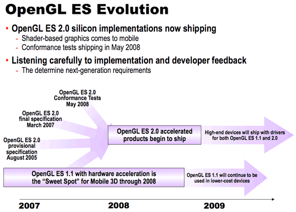 OpenGL|ES的官方组织是:http://www.khronos.org/ 该组织关注于手持和移动平台上的动态媒体编著、播放所需的API,并致力于为这些API建立无限权费用的开放标准。(focused on the creation of open standard, royalty-free APIs to enable the authoring and accelerated playback of dynamic media on a wide variety of platforms and devices.)