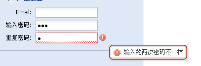 ExtJS中表单验证使用自定义vtype示例 验证失败时,出现的提示信息,是我们在定义vtype时,所设置的默认值“两个指定组件的组件值不一样”这样的文字,如果需要改成另外的提示信息,可以通过重写repetitionText字段实现。Ext.form.VTypes.repetitionText = '输入的两次密码不一样'; 运行效果如图:
