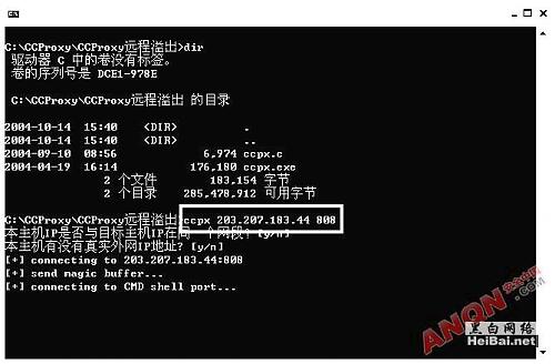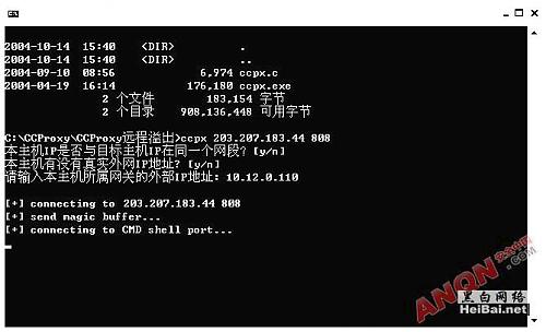 CCProxy溢出程序的使用非常简单,在命令窗口中输入“ccpx 目标IP地址 端口”,然后按提示操作即可(如图2)。在溢出中会询问本机是与攻击目标位于同一个IP段;如果是在同一IP地址段中的话,直接按“y”,就可以开始溢出了;如果本机与攻击目标不在一个IP地址段中的话,按下“n”,溢出程序将继续提示并询问本机是否有一个公网IP地址(如图3),如果没有的话,还需要手工输入自己的网关IP地址才可以开始溢出。溢出成功后,会在当前命令窗口中自动连接攻击目标的24876端口,获得远程主机的一个SYSTEM Shell。剩下来的事就是建立管理员帐号,常常的掌握这台肉机。